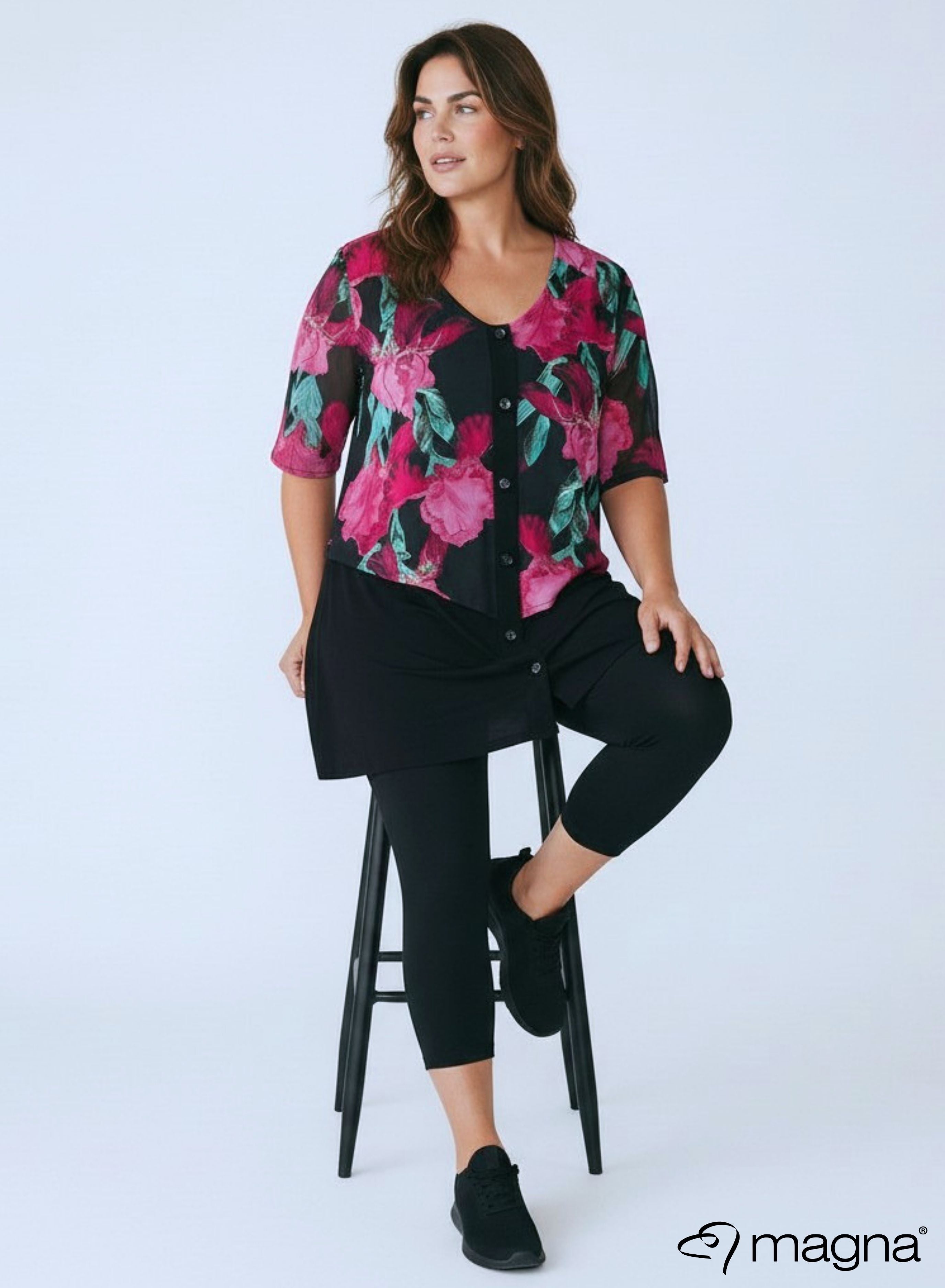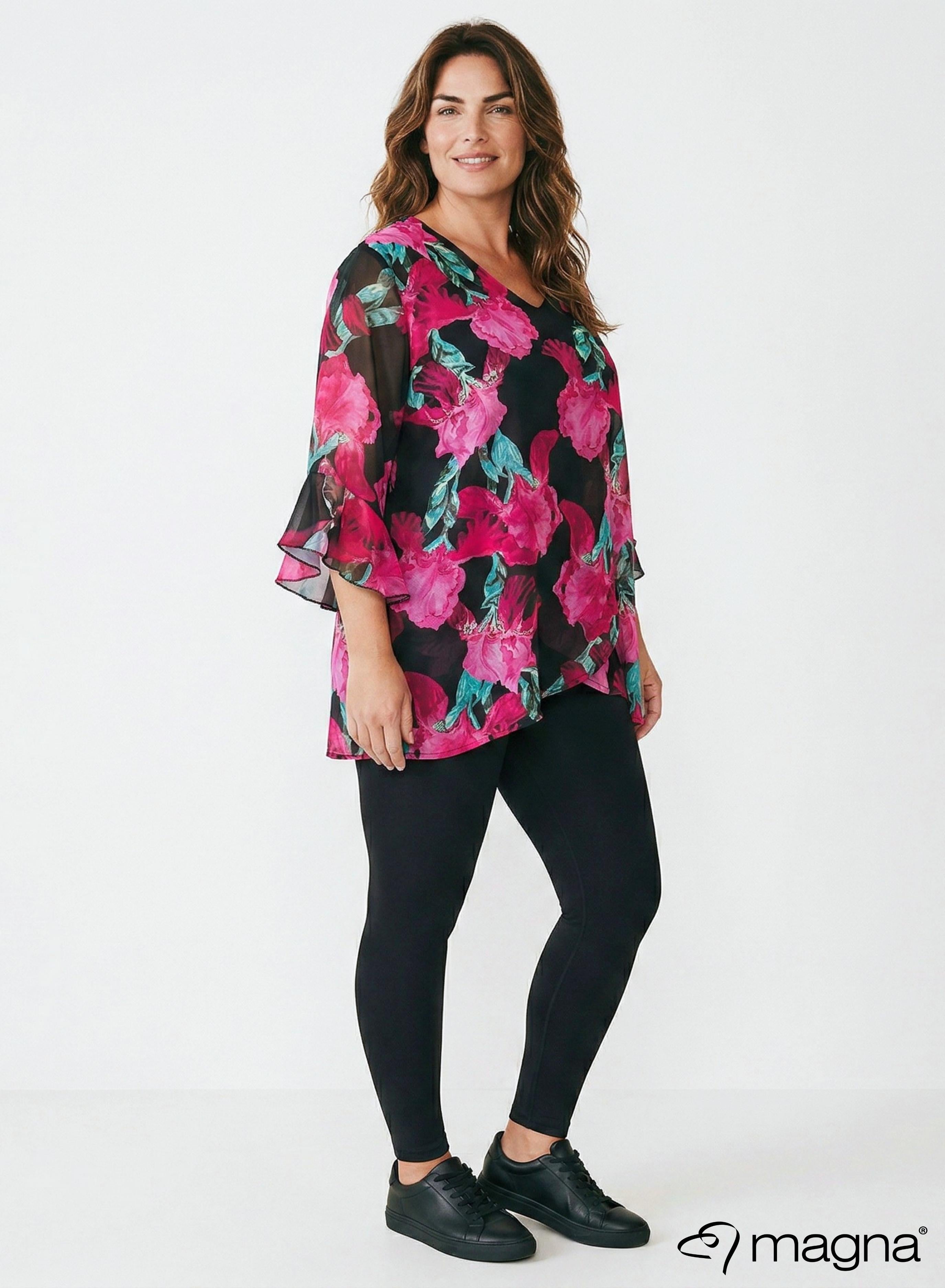 Magna Chiffon Laagjes Tuniek Korte Mouw Magenta Groen Bloemenprint
