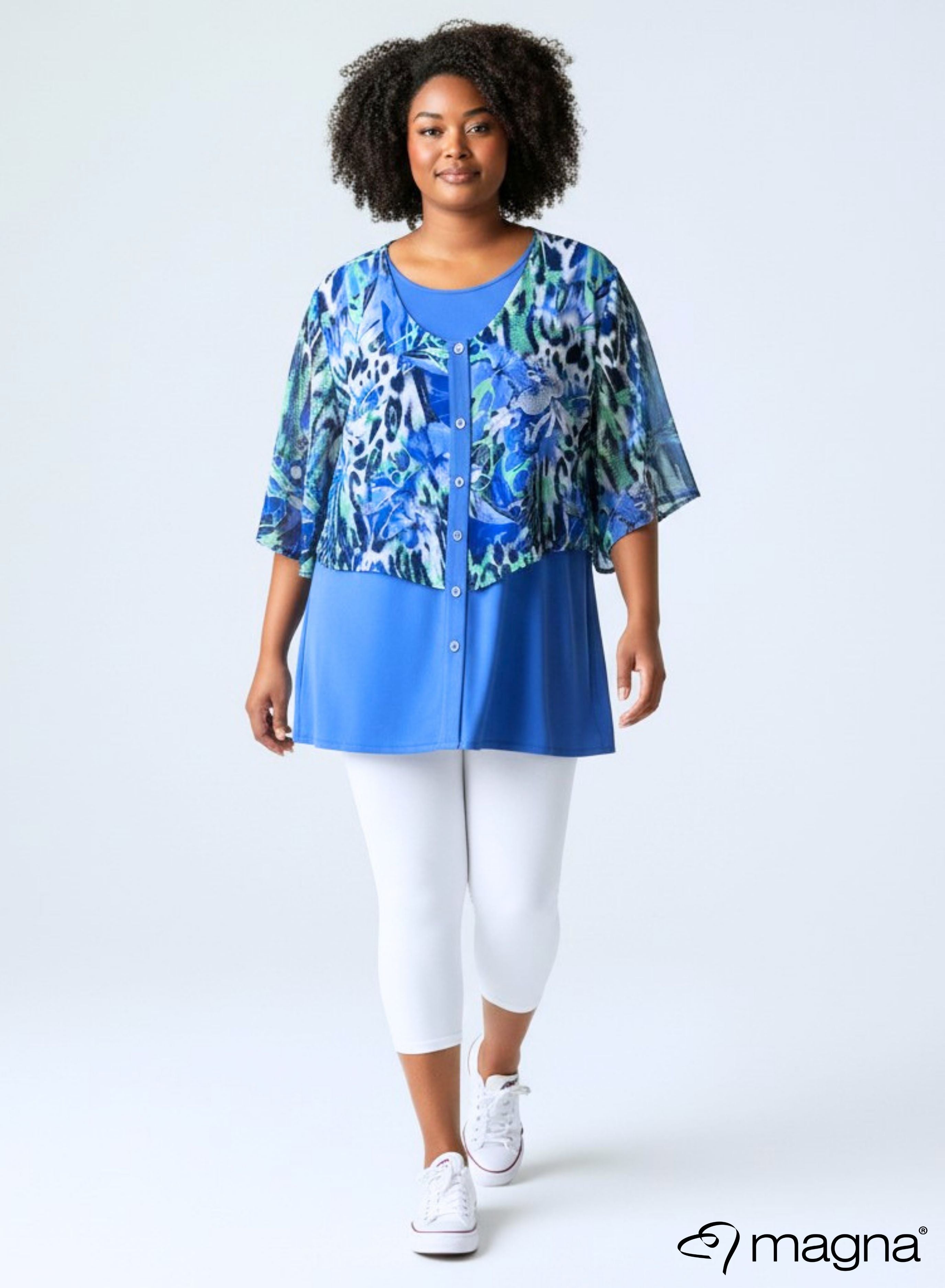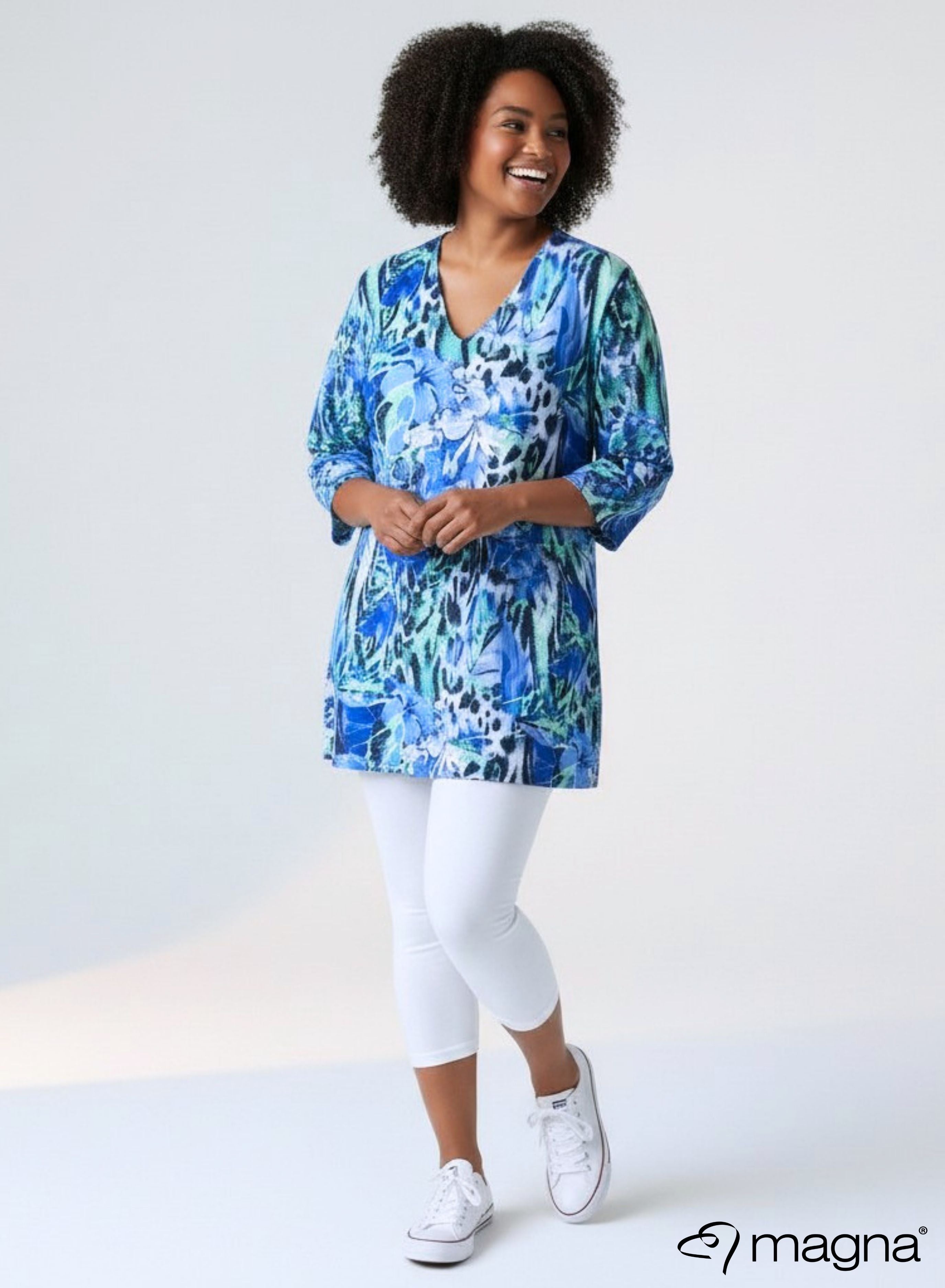 Magna Chiffon Laagjes Tuniek Korte Mouw Dierenprint Bloemen Blauw