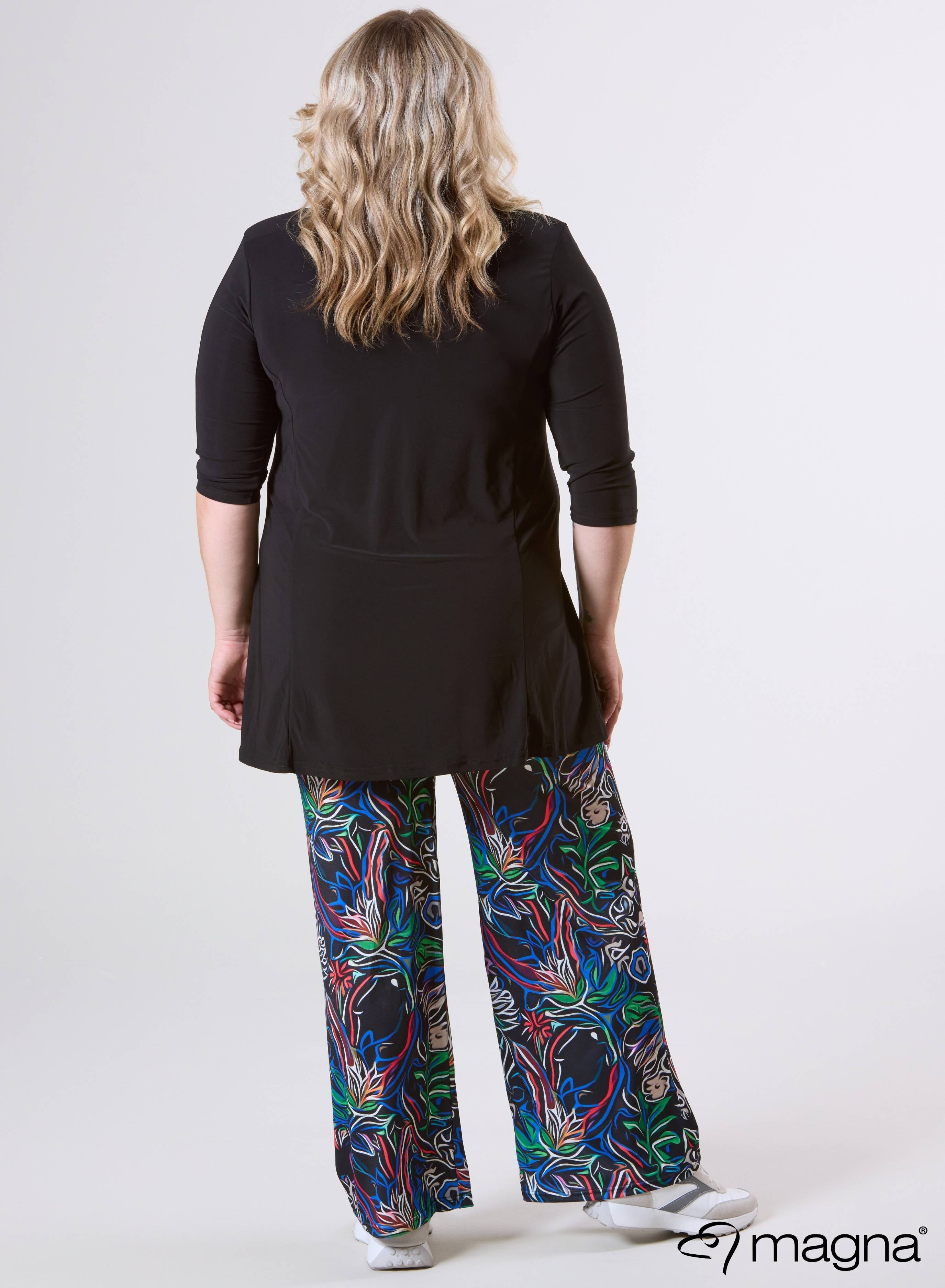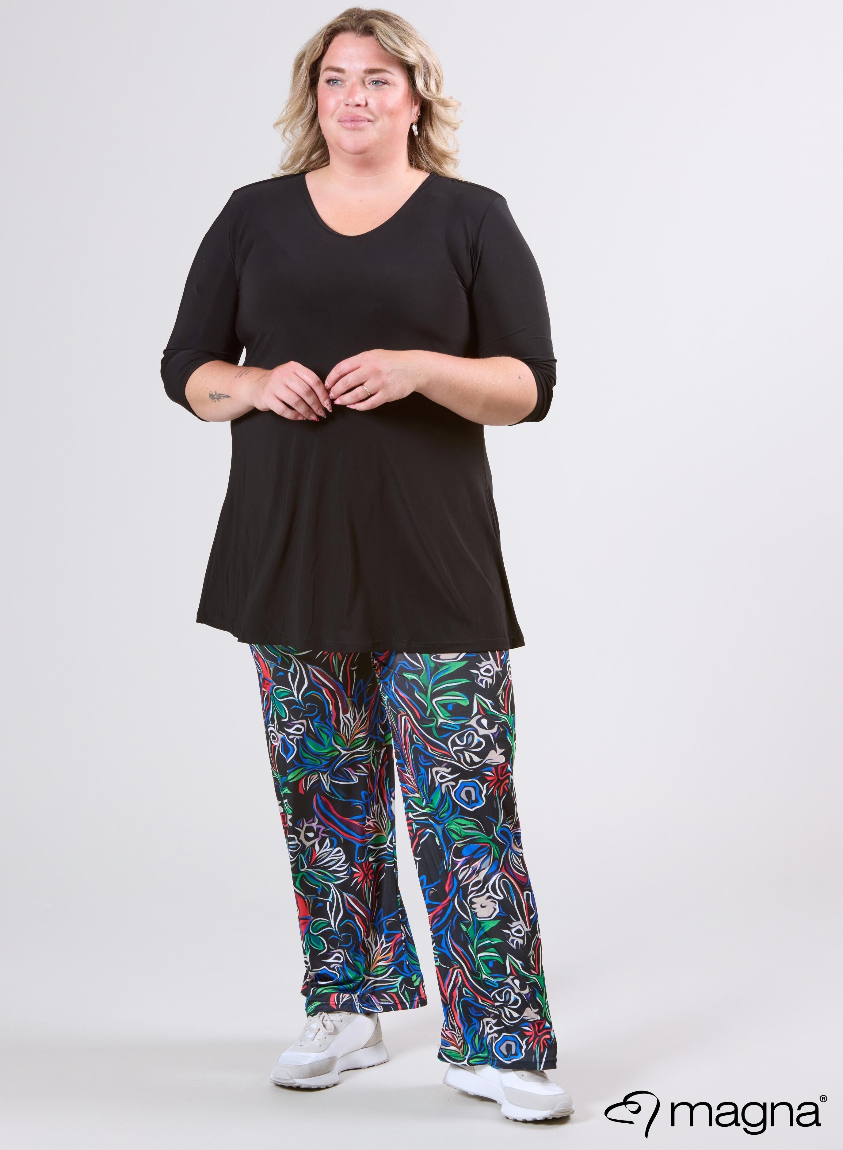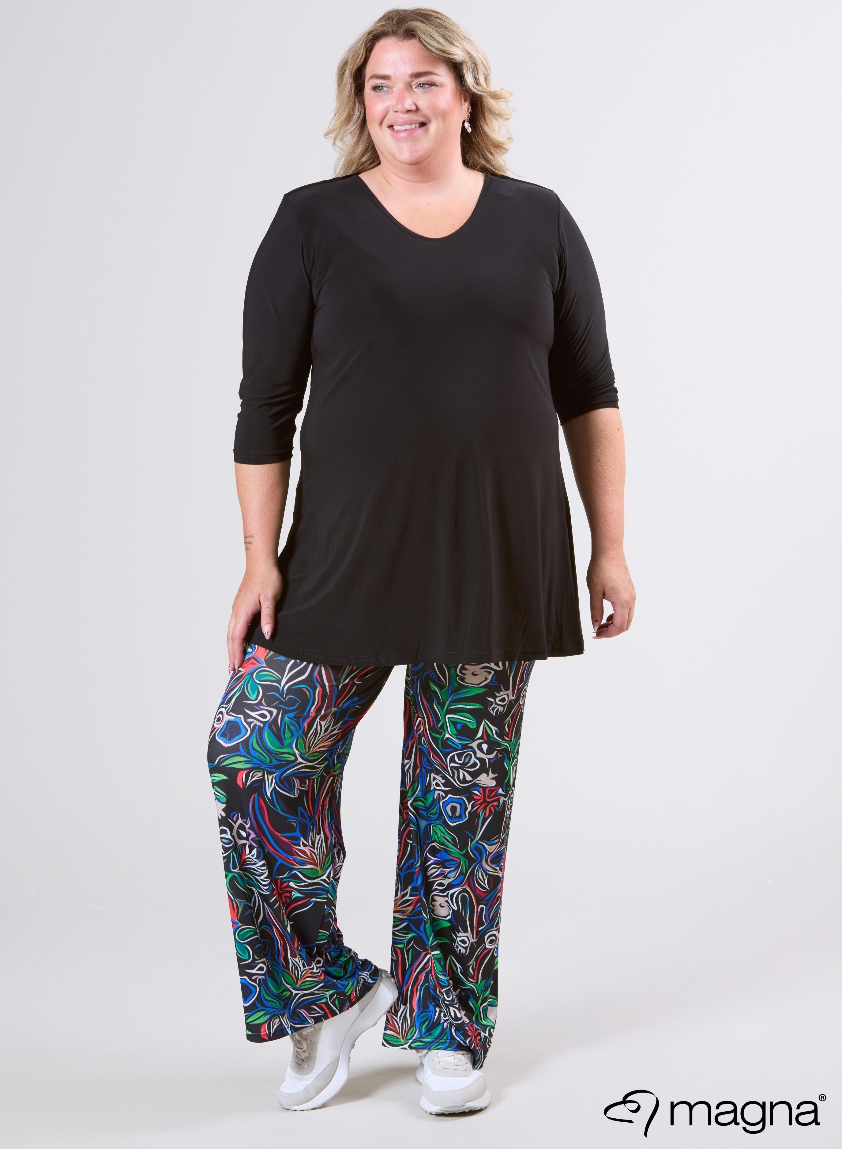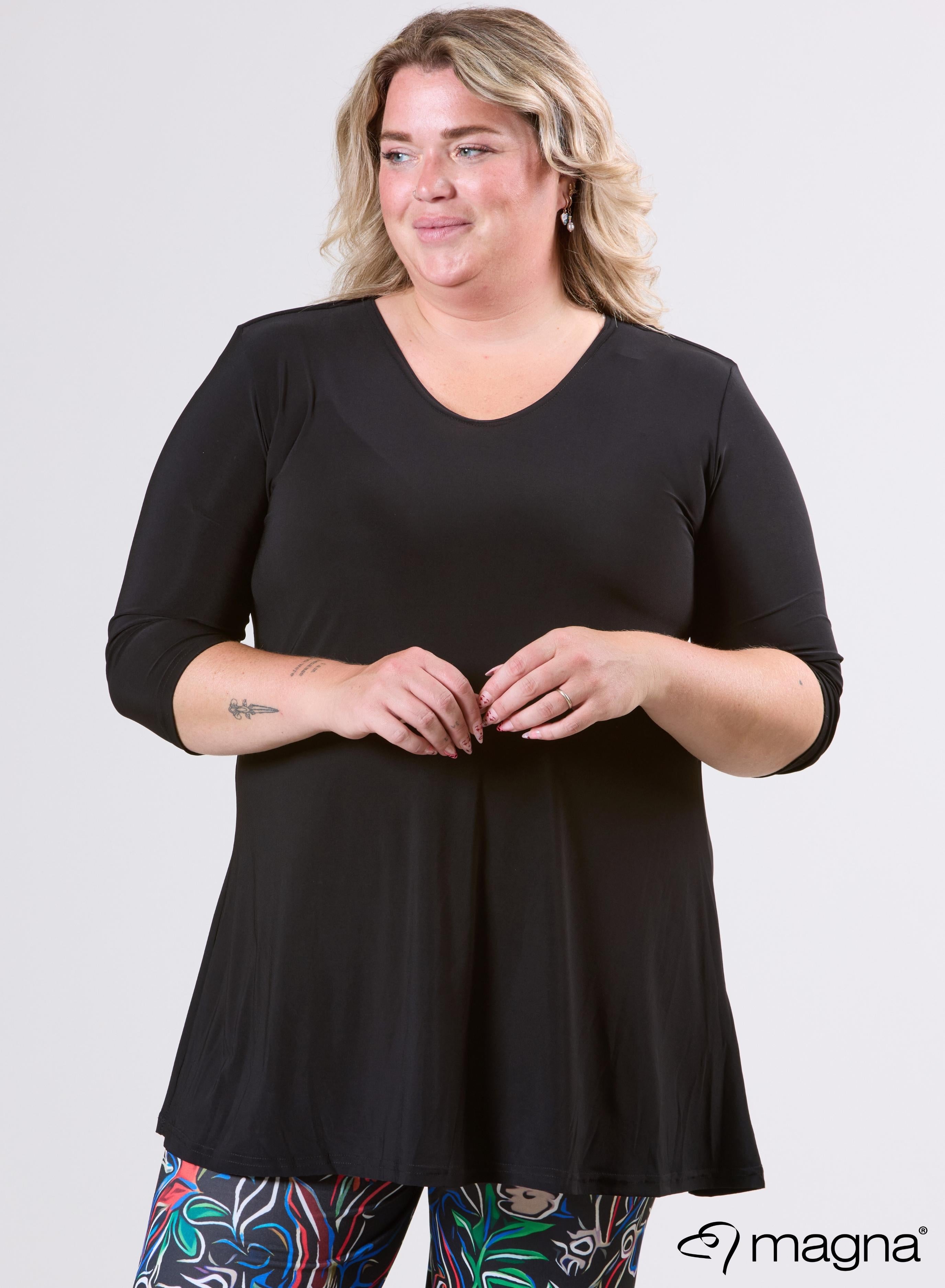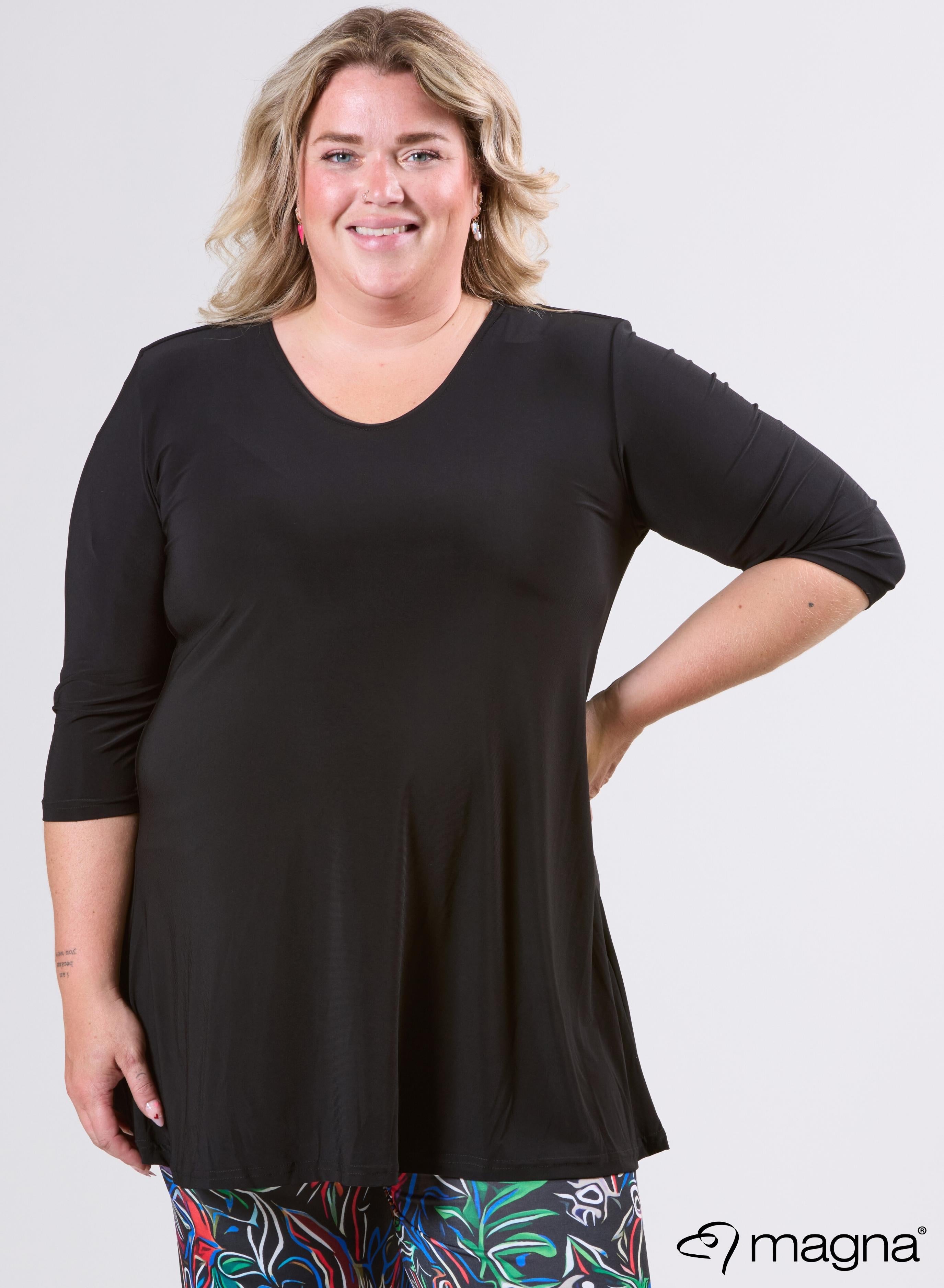 Een echte garderobe must-have, de Magna A-lijn Travel Shirt / Tuniek in Zwart is een bestseller en onmisbare basic voor Curvy vrouwen die houden van moeiteloze stijl en comfort. Dankzij de flatterende A-lijn pasvorm valt de tuniek soepel over het lichaam en creëert een slank en elegant silhouet.